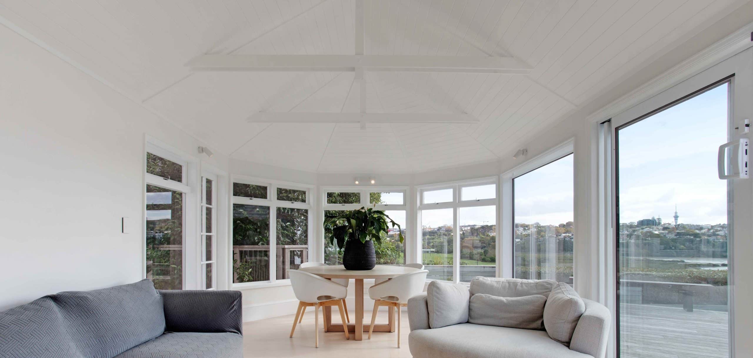 From the ground up, the home has been thoughtfully rebuilt. The original 100-year-old “block and stick” foundations were well below modern building standards and unsuitable for the Shore Road cliff face. As expected, the floor had also shifted significantly over time. We replaced the outdated system with modern concrete piles and new bearers. We also added new load-bearing piles to support the third-story addition. During this process, we re-levelled the floor, restoring both its form and function for lasting strength and stability. Working closely with engineers, we installed steel beams, point loads, and portal frames to prepare for the new upper level. This also allowed us to straighten and square the original walls, many of which had shifted over the past century.