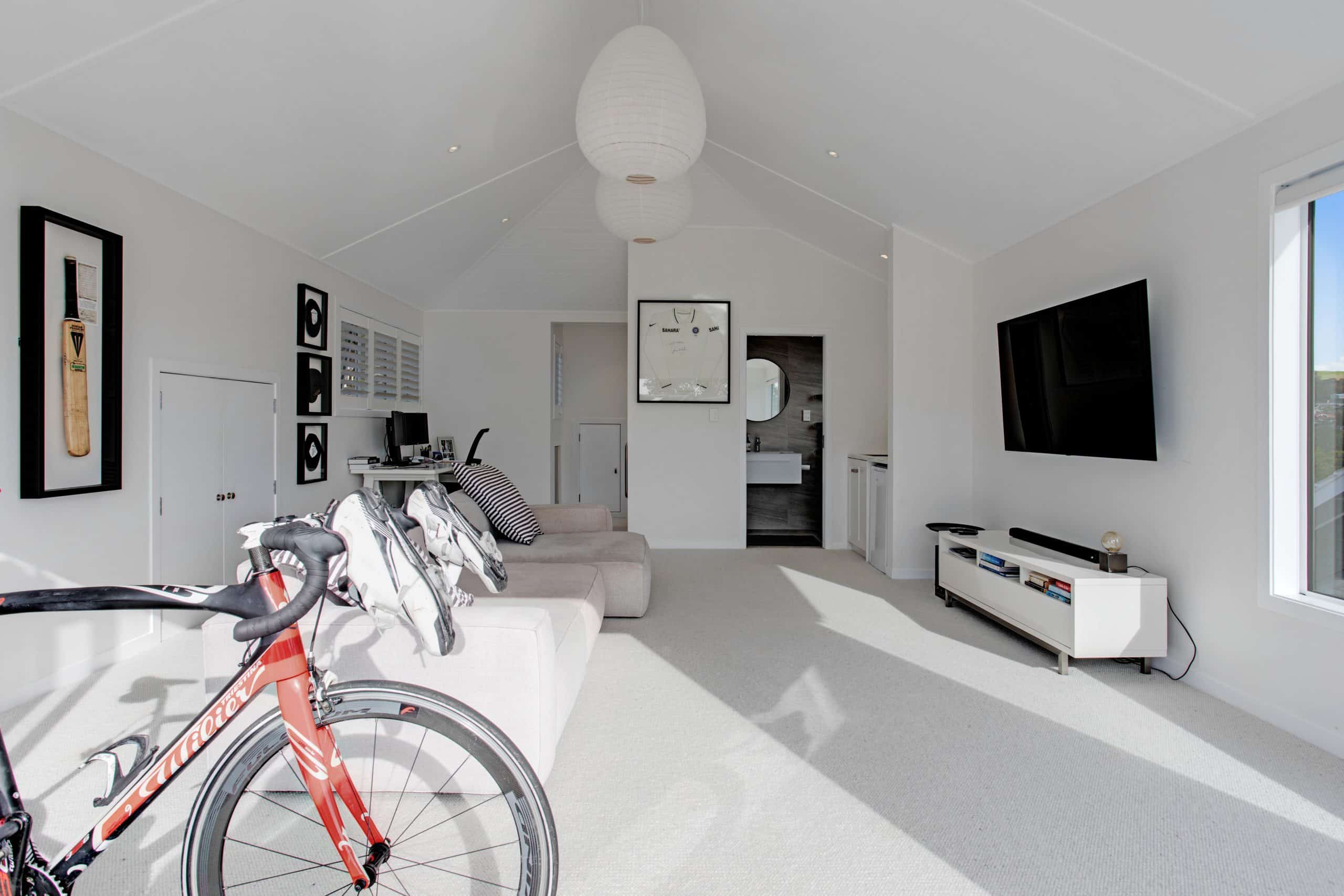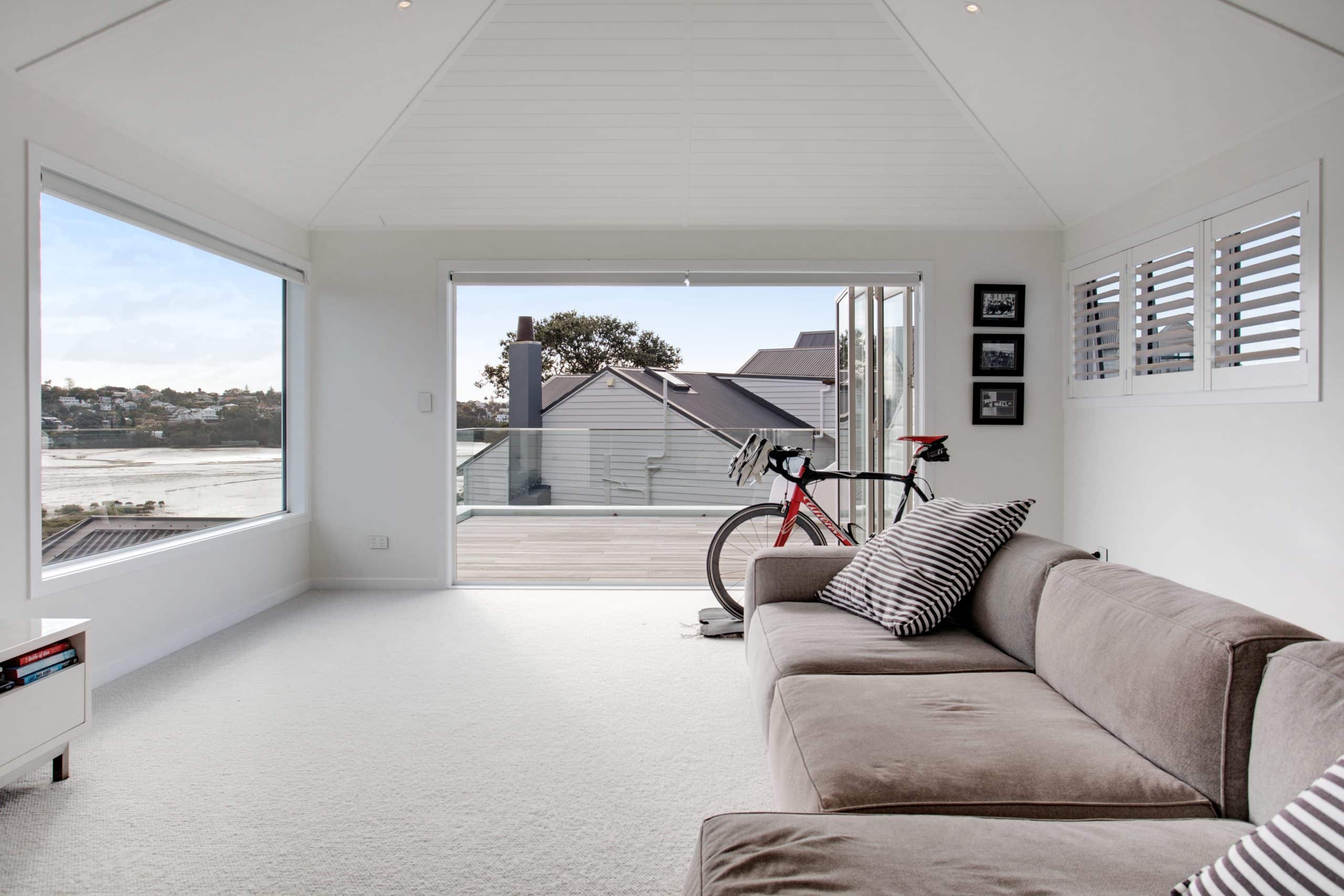 The top floor is a spacious entertainment area perched above the Shore Road reserve, offering views across Hobson Bay’s mangroves and the Auckland city skyline. To maximise this room, we used modern techniques to create a second, high-pitched skillion ceiling, adding volume and grandeur to the space. This level also features a floating Kwila deck laid over a low-slope waterproof membrane. A glass balustrade surrounds the deck, offering panoramic views of the reserve, city, and newly finished outdoor living space.